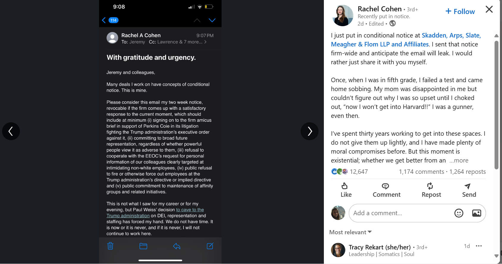 Trump kararlarından etkilenen Skadden, Arps, Slate, Meagher & Flom’da henüz üçüncü yılında olan finans avukatı Rachel Cohen, Paul Weiss’in Trump ile anlaşmasının ardından, Skadden patronlarına, Trump kararlarına karşı durmaları gerektiğine dair, bir e-posta gönderdi. Bu e-postasını da kendi Linked-in hesabından paylaştı.